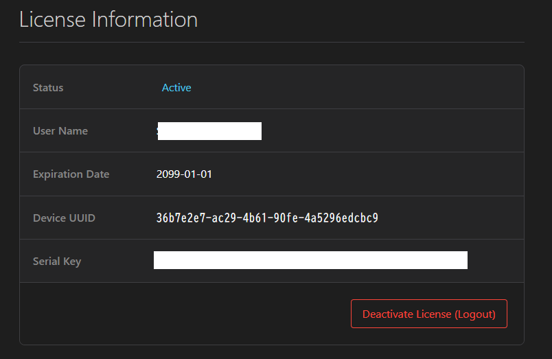 ここにライセンスの詳細と使用期限、そのブラウザのUUIDなどが表示されます。 もしライセンスを他のPCに移動したい場合などには、「Deactivate License(Logout)」 ボタンをクリックして、ライセンスを解放してください。その後別のPCやブラウザから同じライセンスキーでアクティベーションが可能となります。