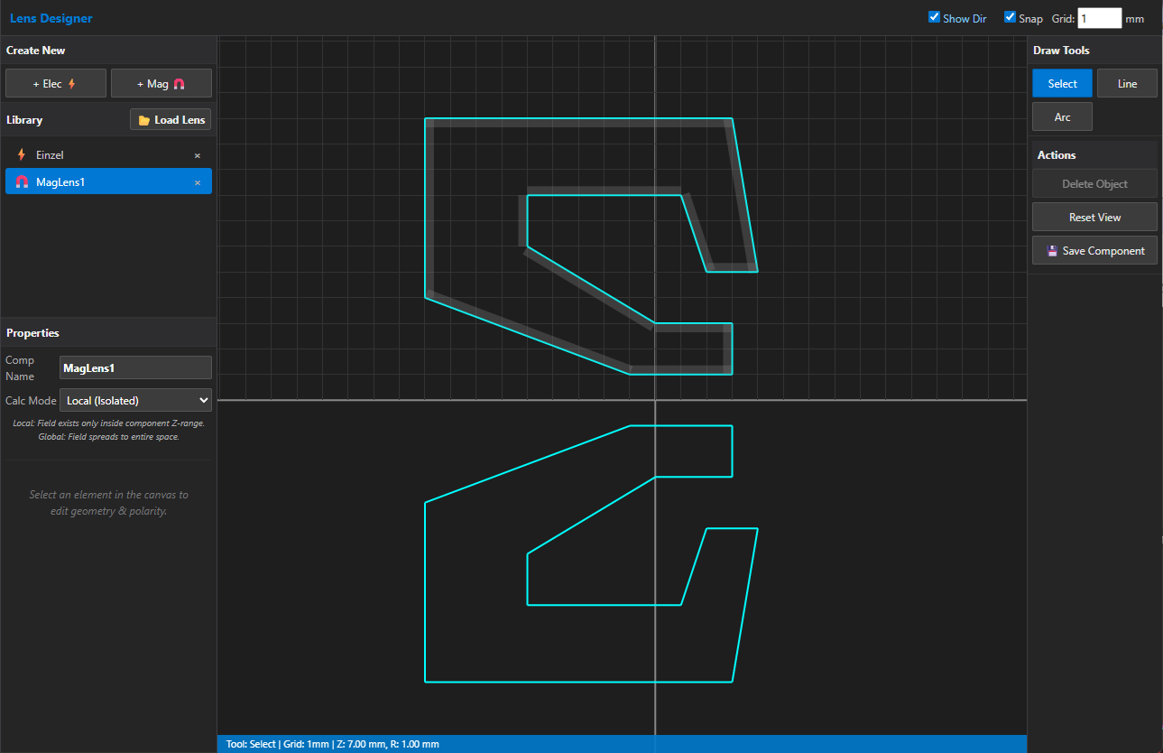 “[+ Mag]“ボタンにより、新規に磁界レンズのモデリングを開始します。