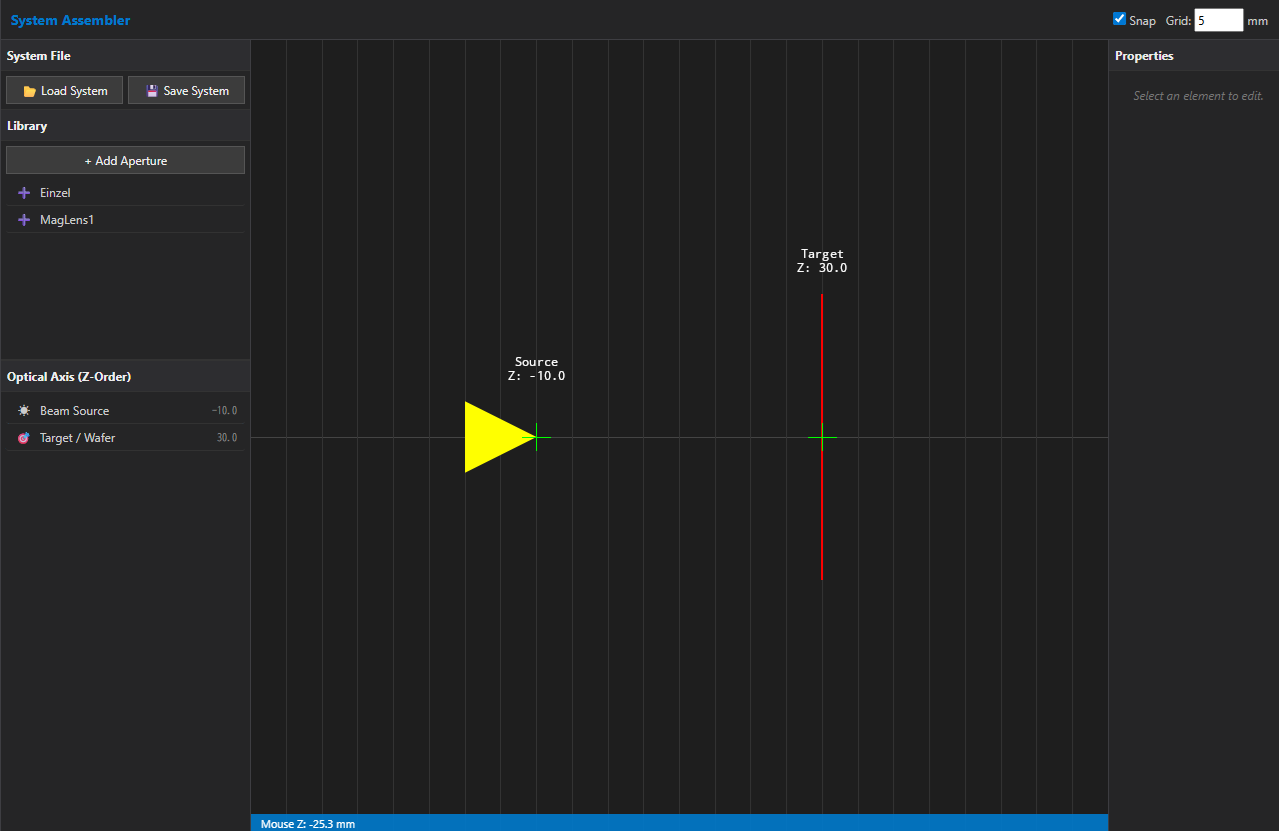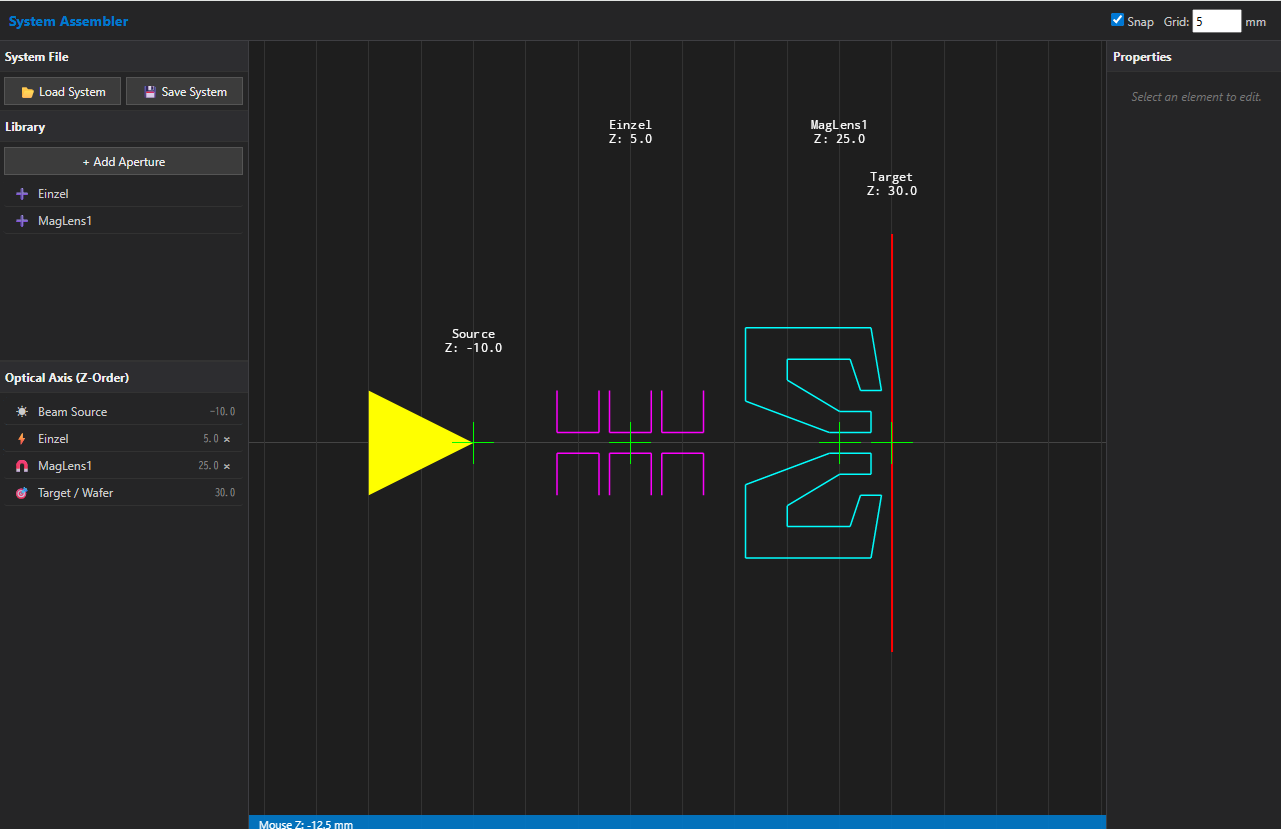 System Assembler では、作成したレンズを組み合わせ、光学系(例:カラム)を形成していきます。