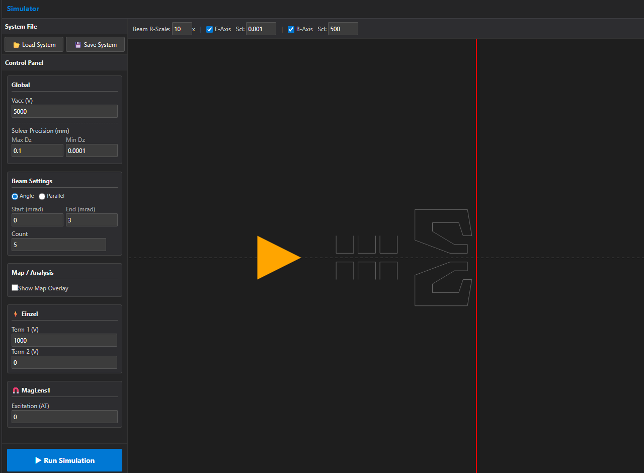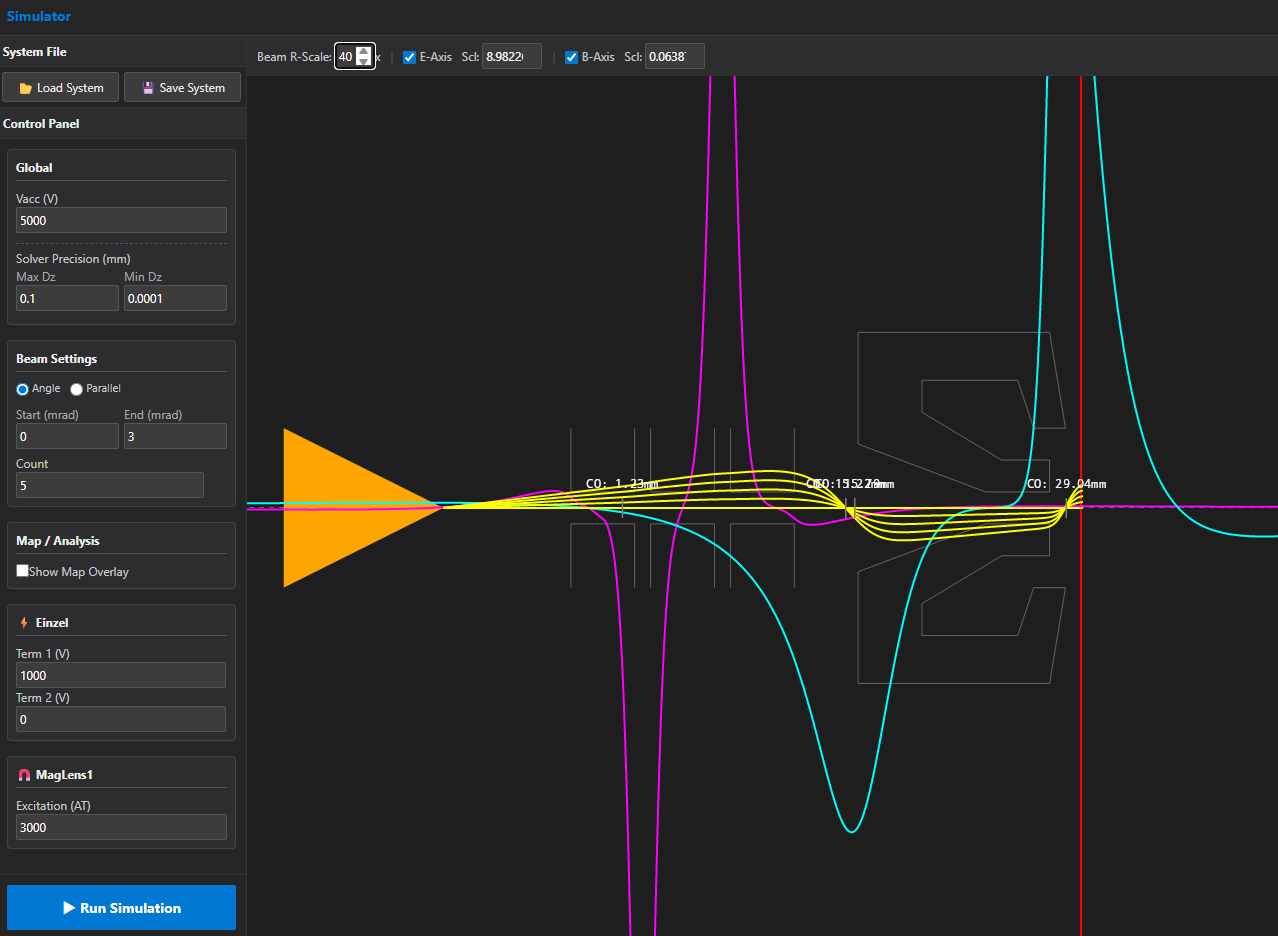 回転対称系 - 境界要素法ベースのシミュレータです。電子レンズや電極磁極が生成する任意座標の電磁界や、球面収差を含む電子軌道計算(近軸方程式ではなく実軌道計算)、レンズ(主に対物レンズ)の収差の計算を行うことができます。有限要素法のようなメッシュを必要としない為、高速/高精度なシミュレーションが可能です。境界要素法は一般にモデリングが大変ですが、本ソフトウエアはモデリング用のCADツールも含んでいます。