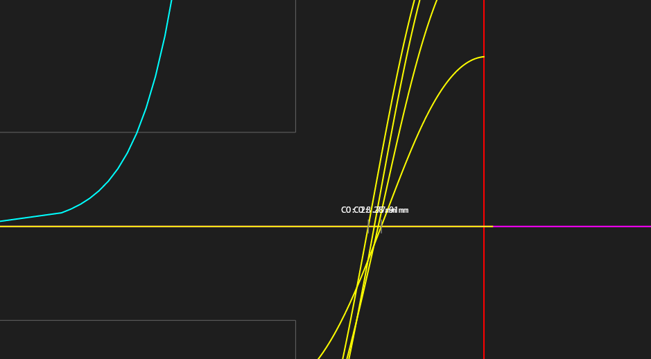 ビームがR=0の軸(Z軸)と交差する点に、”CO: xxxmm“のようにクロスオーバー位置(あるいはフォーカス位置)のZ座標が表示されます。