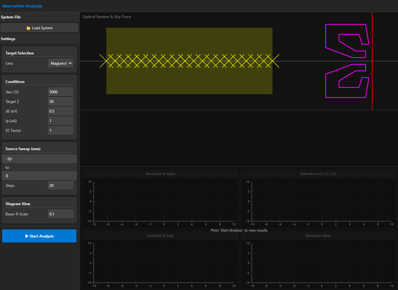 レンズモデリング-光学系内への配置-電圧/AT設定-ビーム軌道計算までの一連の流れをシームレスに行うことができます。レンズの収差解析も可能であり、いわゆる"最適開き角(α)“や"収差の谷"も得られます。