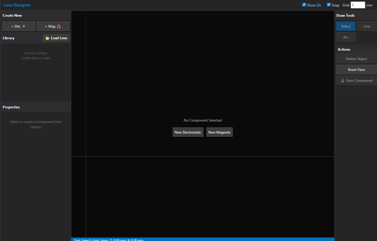左上の”[+ Elec]“や”[+ Mag]“をクリックすることで、静電レンズもしくは磁気レンズのモデリングを開始します。もしくは”[Load Lens]“によりローカルファイルを読み込むことができます。