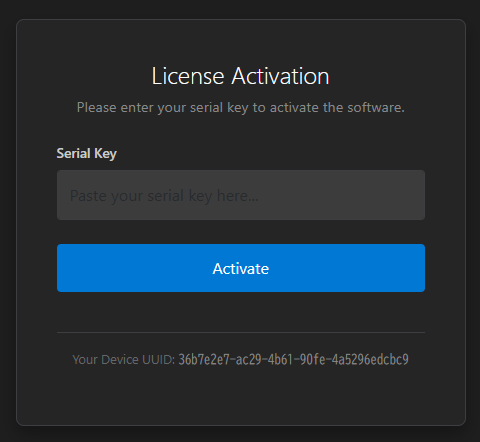 ソフトウエアを初回起動すると、下記のような画面となります。“Serial Key"に弊社より連絡があったキーを入力することで、ソフトウエアがアクティベーションされ起動可能となります。