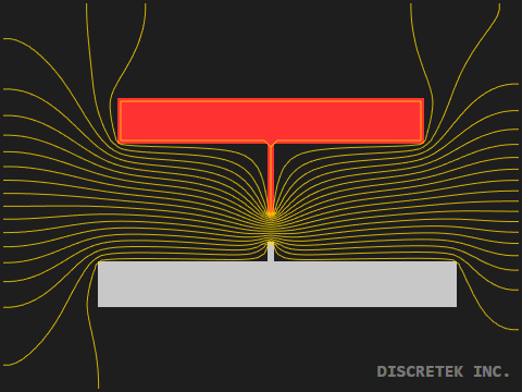 当然、対向電極間の電界が強くなりますが、それとは別に電極の角に電界強度が集中していることが分かります。 物体は尖った部分に電界が集中するため、もし放電するとしたらまずは角が危なそうだということがここから判断できます。電極の角を丸くしたり、形状を工夫することで角部の電界強度を弱くして、放電リスクを小さくすることができます。